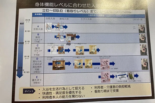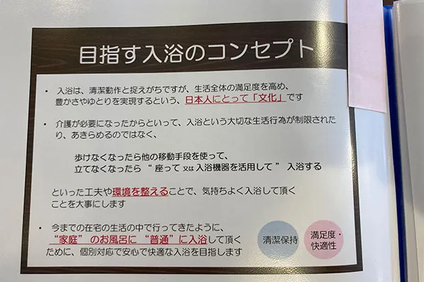 一通り案内をして、お風呂の説明をした際に、ご家族さんから今ここでデモをしてもらえませんかと言われて、利用者さんにWLC-Tへ座ってもらい、チルトをして浴槽へ入れる手順を行いました。お湯が張ってあれば、すでに入浴できている状態ですよと説明すると利用者さんは、それまでずっと騒々しく言葉を発していましたが、じっと黙ったままになりました。