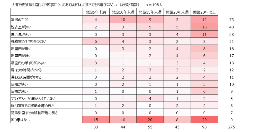 - 開設20年以上の施設では個浴が11件 老朽化や使い勝手の課題が背景にあると推察