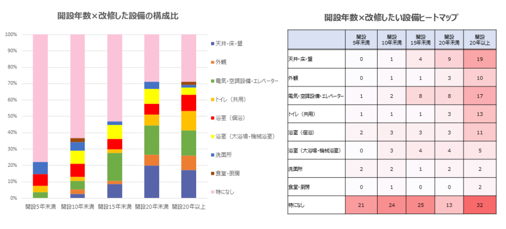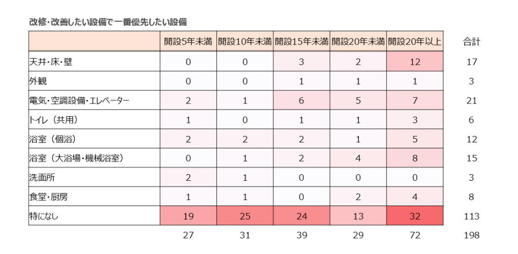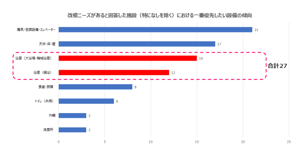 - 浴室(個浴)については開設年数に関係なく、一定数の改修ニーズがある