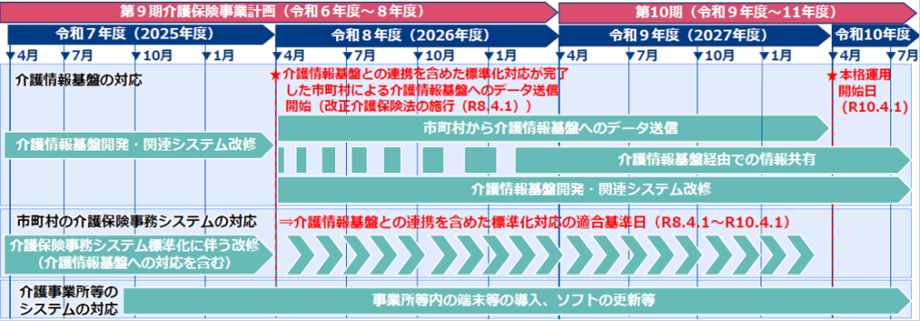 介護保険最新情報vol.1405のなかで、今後のスケジュールについて記されており、令和8年4月1日以降、介護情報基盤との連携を含めた標準化対応が完了した市町村から、順次、介護保険システムから介護情報基盤へのデータ移行、介護情報基盤経由での情報共有を開始するとされており、令和10 年4月1日までに、全市町村において、介護保険システムから介護情報基盤へのデータ移行も含めて完了し、介護情報基盤の活用を開始することを目 指すとされています。