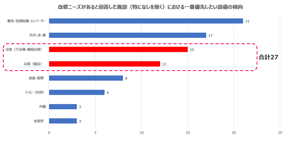 改修・改善したい設備で一番優先したい設備(単一回答)において、浴室(個浴)・浴室(大浴場・機械浴室)合わせた改修ニーズは31.8%となり、安全性・介護負担・利用者満足度の観点からも優先度が高いことが伺える