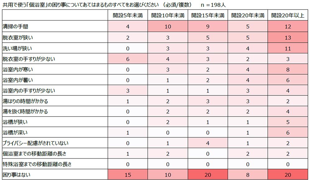 - 脱衣室の手すり不足は、開設年数を問わず継続的に困り事として挙げられている