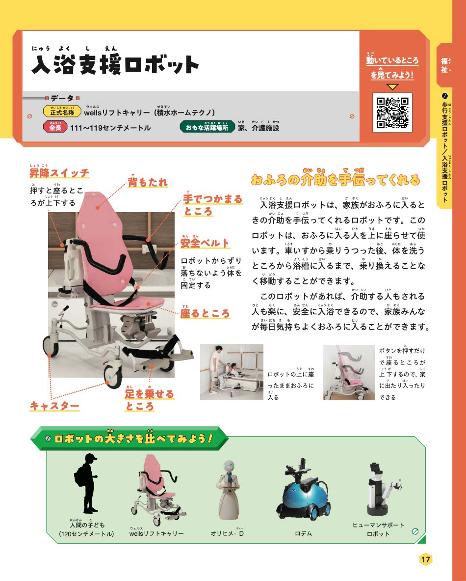 第1巻では【家の中で活躍するロボット(家事、福祉、コミュニケーション)】にスポットを当て、実際に社会の最前線で活躍している具体的な“入浴支援ロボット”として「wells(ウェルス)リフトキャリー」が紹介されています。
